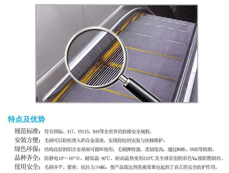 温馨提示:扶梯毛刷的作用:安全、保护、警示、防夹伤、防杂物掉入甲板缝隙等。防止乘客脚进入危险区域。大多扶梯不装设这种毛刷,有些扶梯是在梯级上标识黄色区域来警示乘客进入危险区的,但是有些人不能注意到黄色区域的警示作用,因此相对而言,毛刷的效果会好一些。